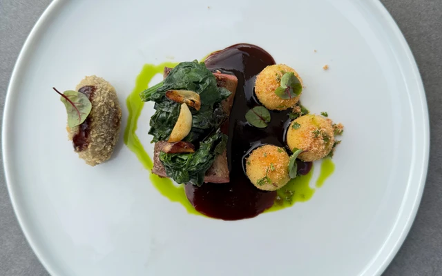 konfitované bramborové kuličky a smažené jehněčí kolínko