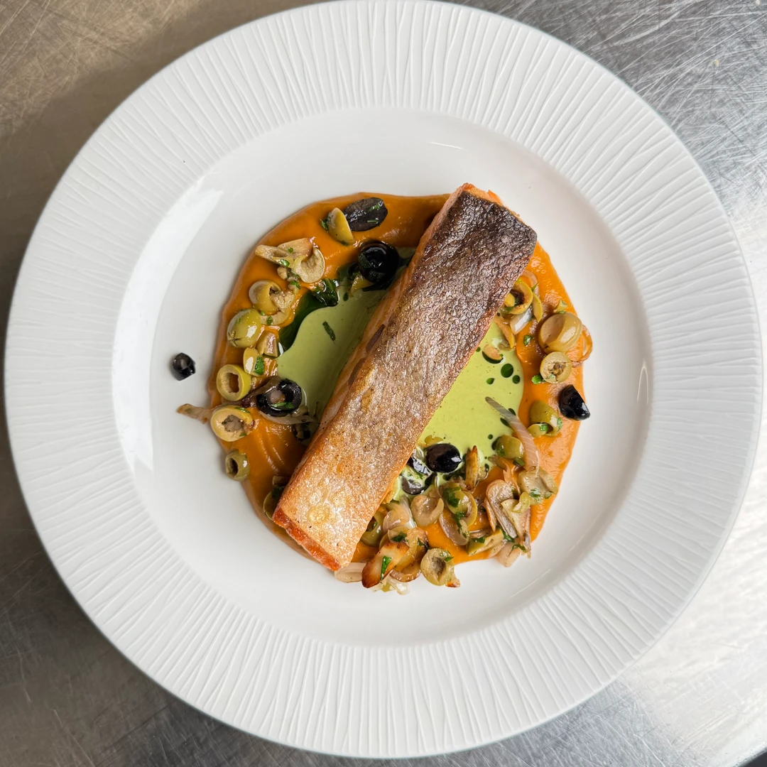 with ratatouille purée, olives, and basil sauce
