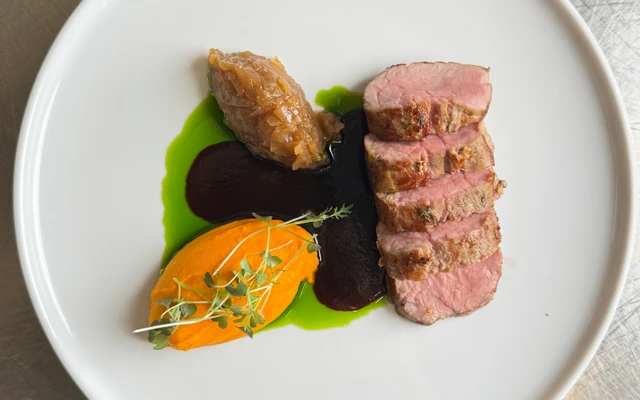 with onion cabbage, carrot purée, and pickled pepper sauce