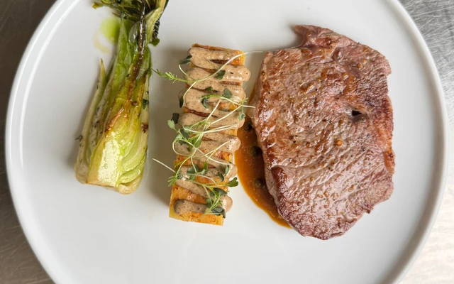 with gratin potatoes, mushroom mayonnaise, grilled pak choi, and shallot sauce