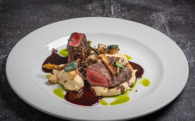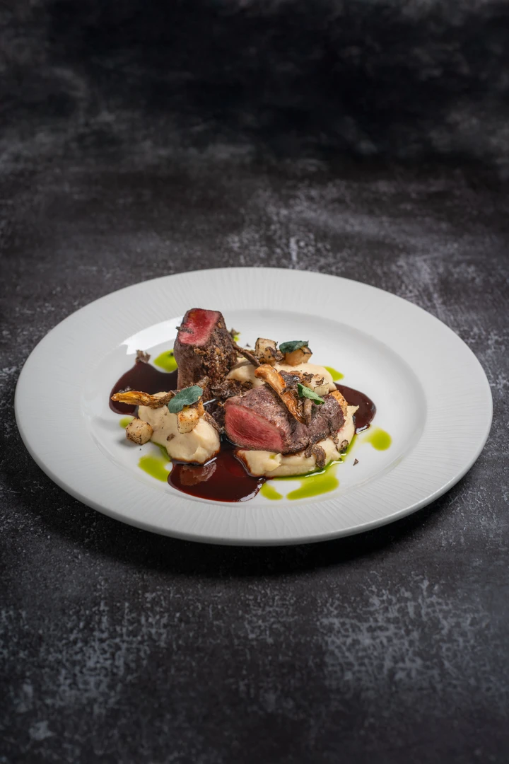 with slices of black Burgundy truffle parsnip purée, roasted oyster mushrooms, roasted celery, and juniper demi-glace