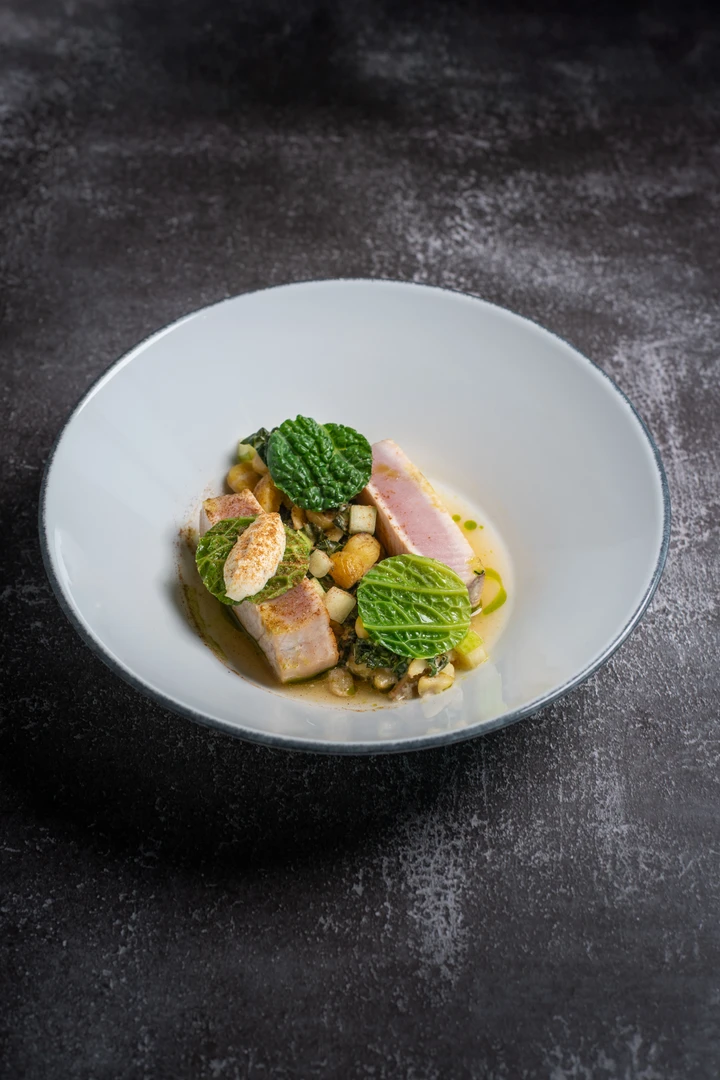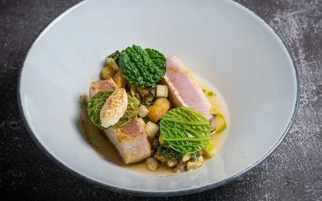 with chestnut ragout with horseradish, pressed apples, cabbage, and citrus dressing