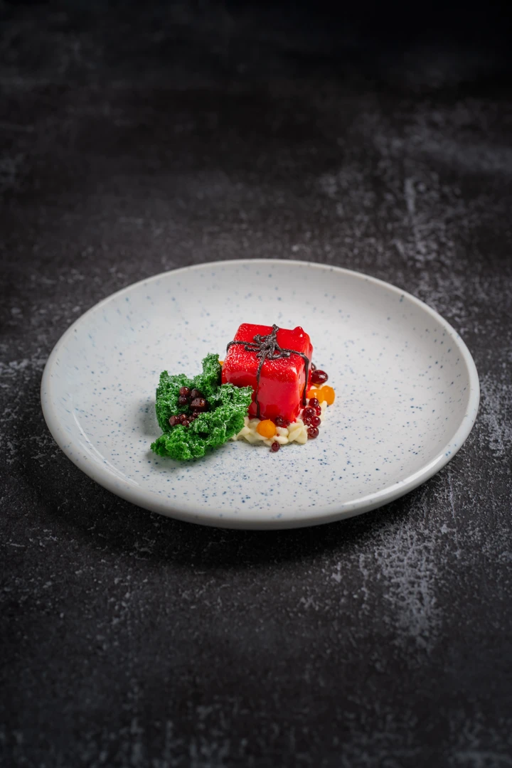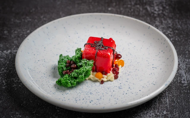 with red velvet sponge cake, sea buckthorn gel, poached wine caviar, and vanilla sponge