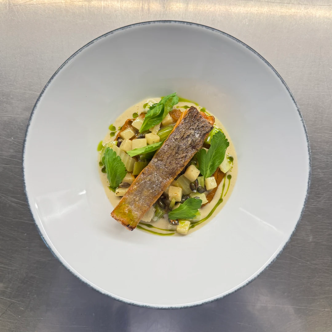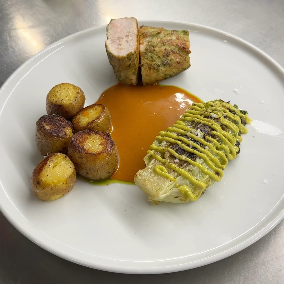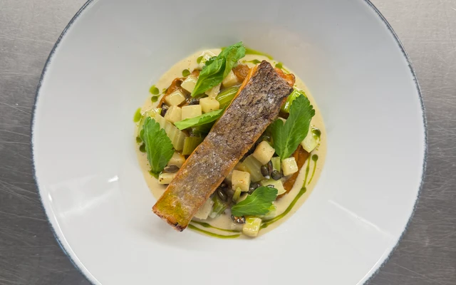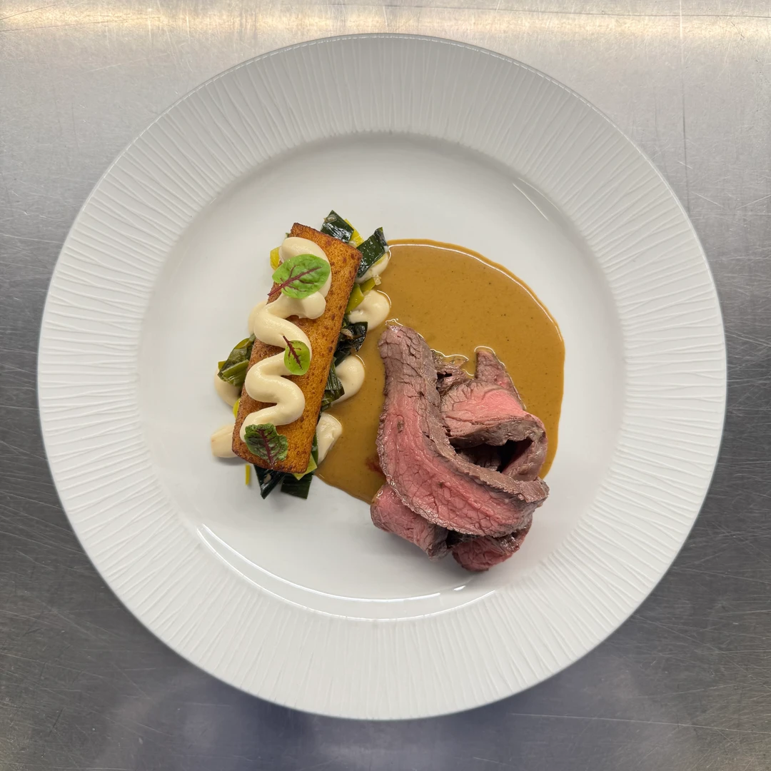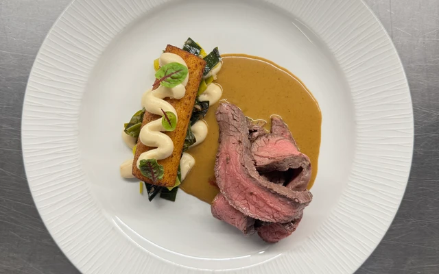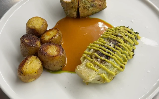 květákovým pyré, restovaným pórkem a pepřovou omáčkou