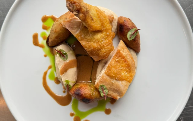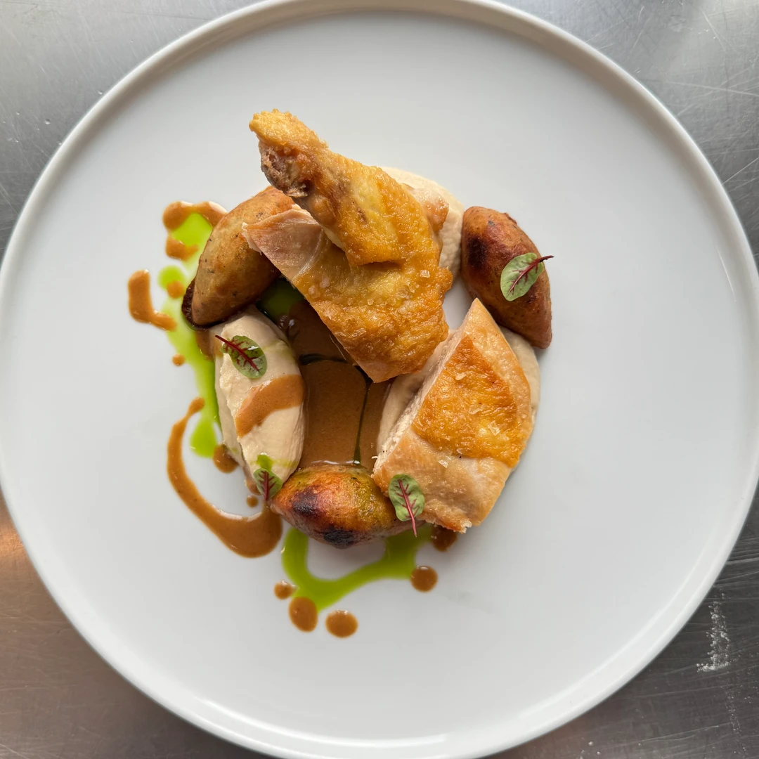 s pyré z pečeného celeru, smaženým bramborovým nokem a tymiánovou omáčkou