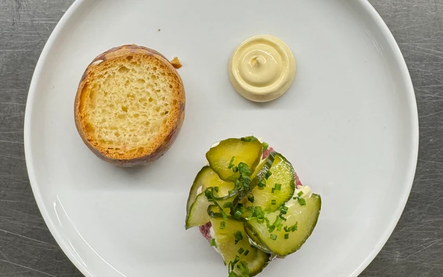 marinovanou okurkou a majonézou z konfitovaného česneku