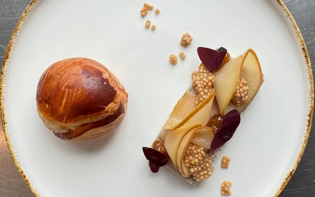 s opečenou brioškou, pošírovanými plátky hrušky a hořčičným semínkem