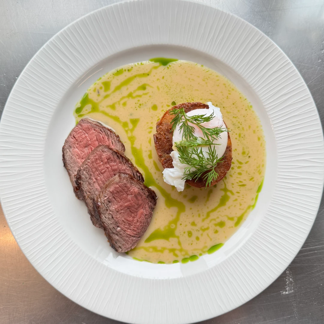 s koprovou omáčkou, karlovarským knedlíkem, pošírovaným vejcem a koprovým olejem