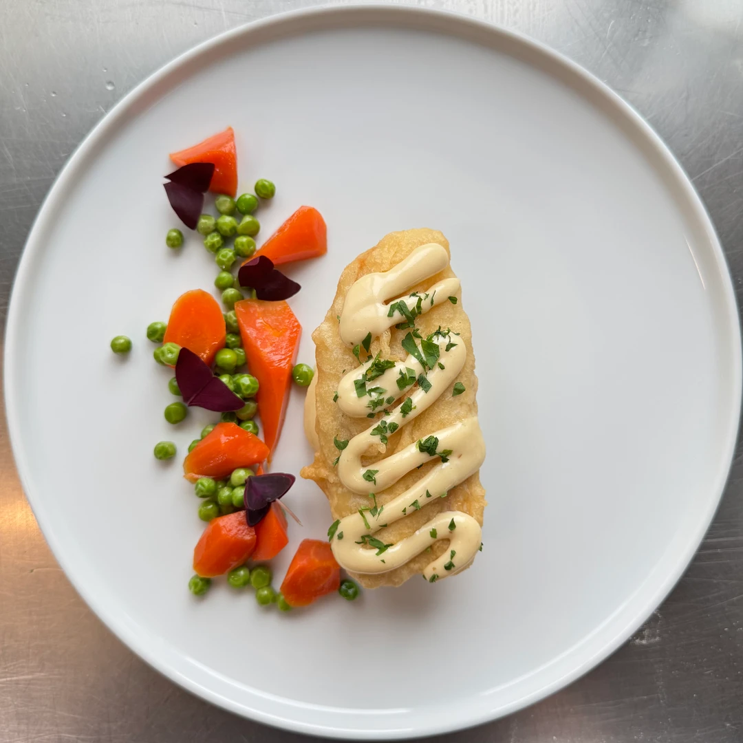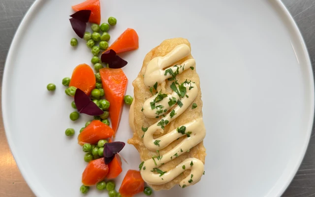 glazovanou karotkou s hráškem a majonézou z konfitovaného česneku