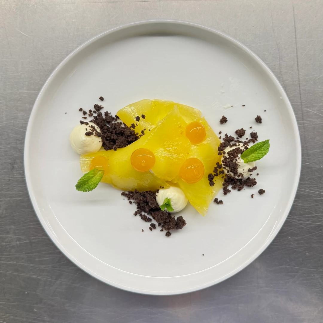 gel z mirabelek, čokoládový crunch, pražený kokos