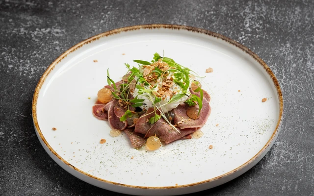 jablečným gelem, chlebovou drobenkou a marinovanou červenou řepou