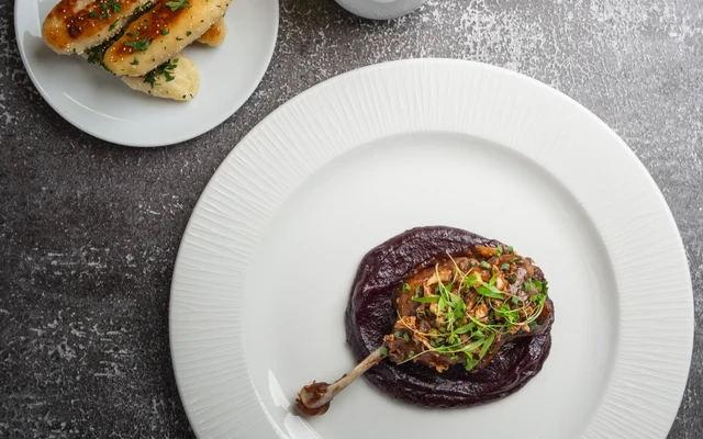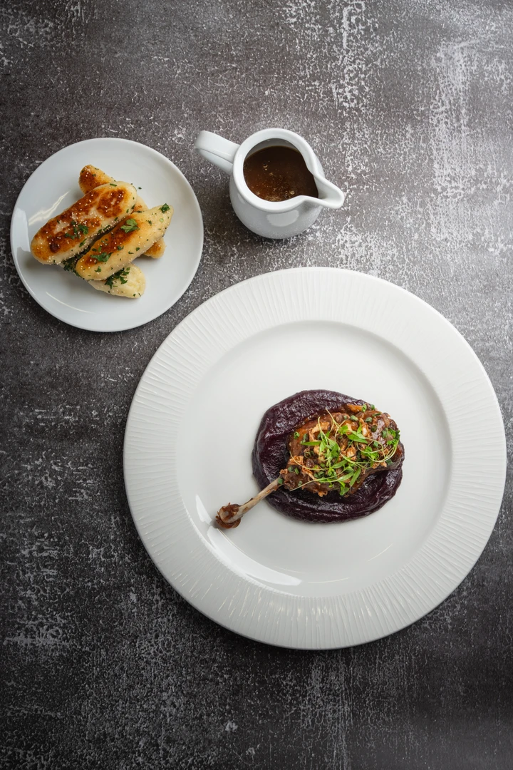 s pyré z červeného zelí, restované šulánky s bílým mákem, kachním glazé a smaženou cibulkou